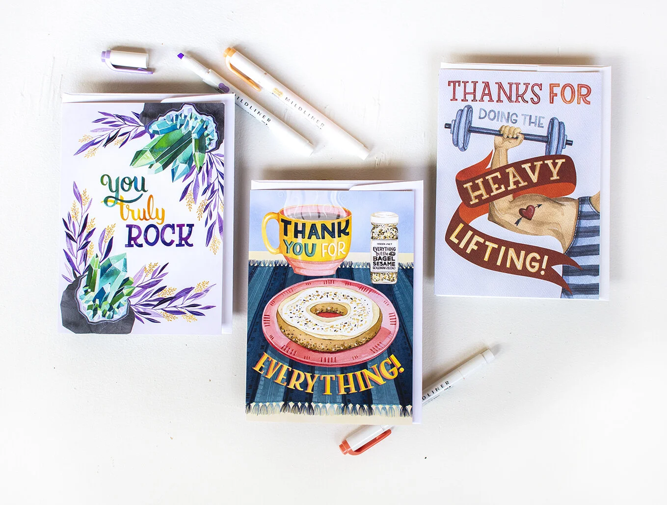 Three new thank you cards—each an exclusive available at our favorite local grocers released in first in the fall of 2020 for their every day greeting card line on beautiful textured/gloss paper. I particularly had a lot of fun playing around with the ever popular everything but the bagel seasoning and cream cheese fan faves at Trader Joe’s for the middle card!