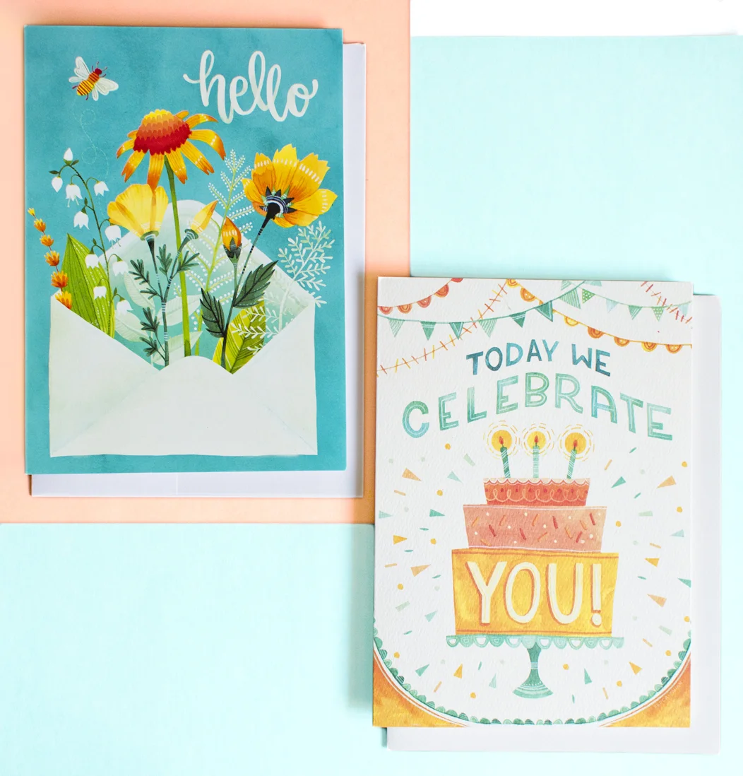 These two colorful greeting cards became available in Summer 2016. The "Today We Celebrate You" birthday card is printed on lush textured paper and the everyday "Hello" flowers in the envelope card is printed on beautiful semi-gloss paper.